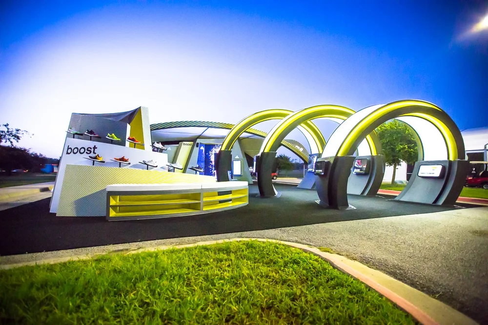 For a 12-city US tour promoting Adidas Boost running shoes, we developed theBoost Energy Platform, an interactive digital running experience that highlighted the power and innovation in the Boost shoe technology. Young athletes were invited to take part in a quick series of interval exercises. Standing on the glowing LED platform the user saw their image full-size on a large video wall. As they ran (cheered by onlookers), we used computer vision, motion sensors, and a Unity game engine to transform the player into a swirling cloud of particles exploding with the energy of Adidas Boost. When they went home, users were emailed a 15-second video of their run to share on social.